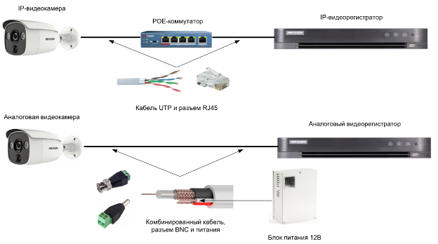 В случае выбора IP-оборудования потребуется прокладывать UTP кабель типа витая пара, при этом одним кабелем можно подать питание на видеокамеру и получить с нее видеоизображение. IP-видеорегистратор может быть со встроенным РОЕ-коммутатором – это позволит подключать к нему видеокамеры напрямую. Или же можно использовать РОЕ-коммутатор для создания локальной сети, в которую подключается видеорегистратор и другие сетевые устройства, к примеру IP-видеодомофон. Если же было выбрано аналоговое оборудование, то, для подключения видеорегистратора и видеокамер можно использовать комбинированный кабель, содержащий в себе коаксиальный кабель и две жиля питания. При этом система обязательно будет содержать в себе источник питания видеокамер.