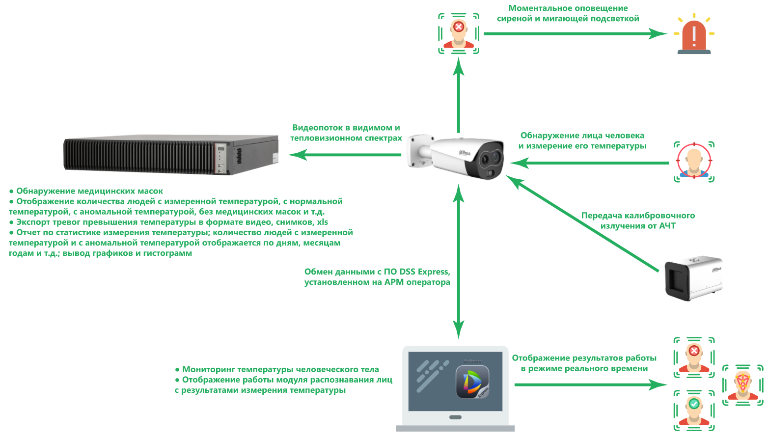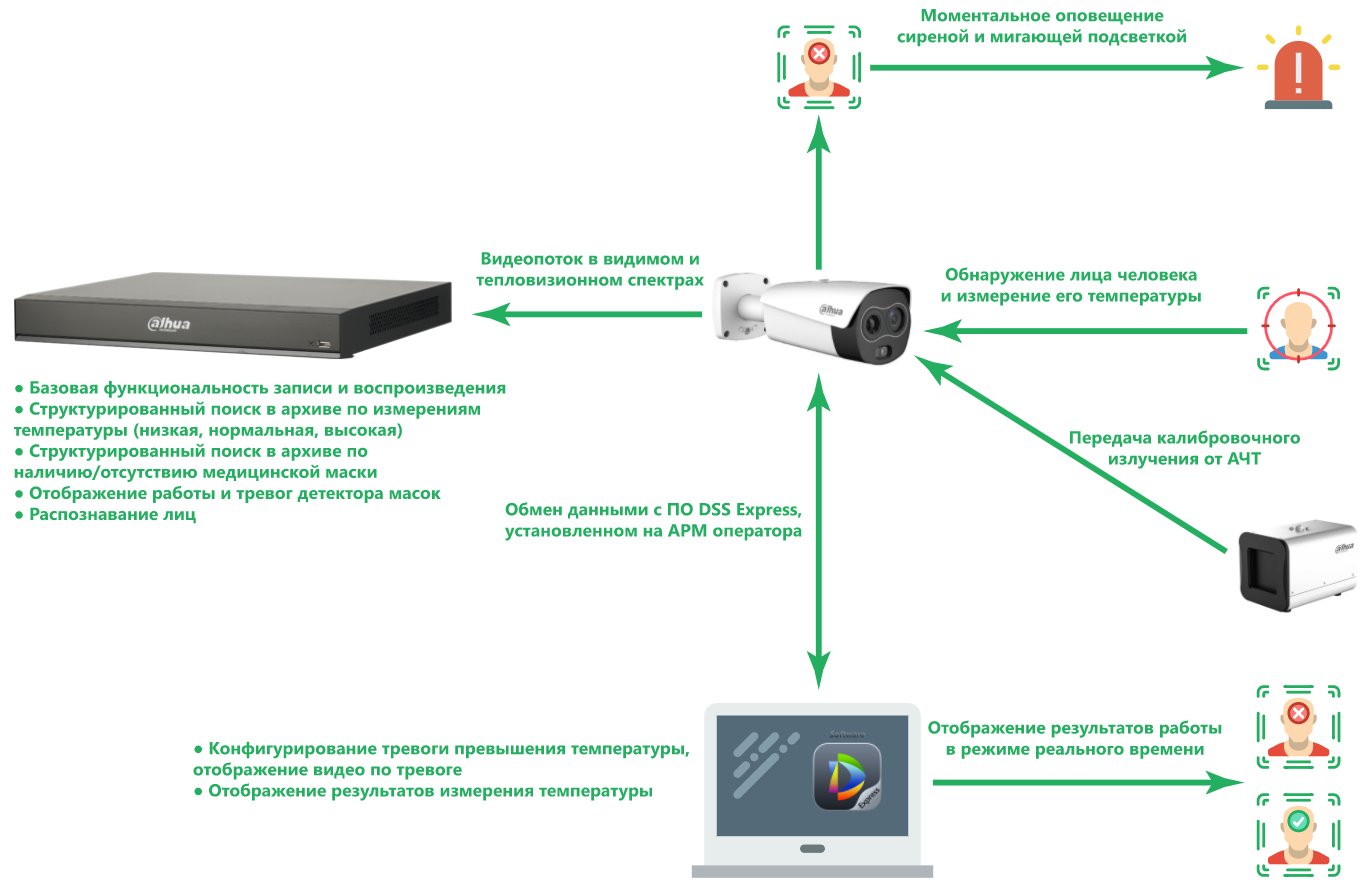 Эти устройства представляют собой камеры с оптическим и тепловизионным объективами. Камеры оснащаются детектором лиц, что дает возможность измерять температуру только в области лица. Если камера фиксирует превышение температуры, подается тревожный сигнал в виде звука и света, а также оповещение на видеорегистратор и в ПО DSS Express. Оператор системы наблюдения делает контрольное измерение температуры медицинским термометром, чтобы получить более точные результаты и принимает решение основываясь на его показаниях.