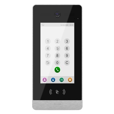 Вызывная панель IP видеодомофона с разрешением видеокамеры 1080Р, на 9999 абонентов уличного исполнения. Позволяет осуществить вызов посетителям на IP домофон, вести видео общение и открытие двери, либо ворот. Имеет встроенный считыватель Em-marine 125 KHz  с количеством поддерживаемых карт пользователей до 10 000 штук. Есть экран с диагональю 7"дюймов, антивандальный датчик, возможность работать по PoE802.3af, высокая степень защиты IP66. Цвет корпуса чёрный (окантовка серебро)