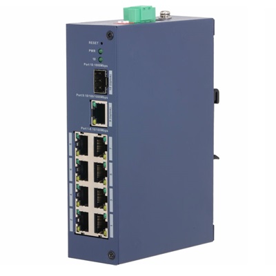 10-портовый коммутатор Dahua DH-CHS4110-8ET с функцией облачного управления Порты: 8 RJ45 10/100Мбит/с, 1 RJ45 10/100/1000Мбит/с (uplink), 1 SFP 1000Мбит/с (uplink); питание: 12В(DC); грозозащита: до 6кВ; рабочая температура: -30°С~+65°С; IP30, IK06; монтаж на DIN-рейку.