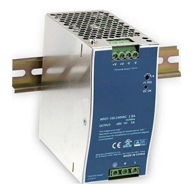 Блок питания 48В/240Вт Dahua EDF-240-48. Входное напряжение: 85В~264В (AC) / 90В~370В (DC); выходное напряжение: 48В(DC), регулируется в диапазоне 44-52В(DC); ток нагрузки: 5А; рабочая температура: -40°С~+70°С; монтаж на DIN-рейку