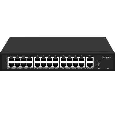 FE-24FPG2 - PoE коммутатор 24x100 Мбит/с PoE порта + 2x1000 Мбит/с порта Uplink, поддержка 802.3af/at (до 30Вт на порт), общий бюджет PoE 300 Вт, режим CCTV (дальность до 250м), режим VLAN, коммутационная матрица 8.8 Гбит/с, таблица MAC адресов 2К, встроенный блок питания, грозозащита и защита от статического электричества, от -10°С до +50°С, крепления для установки в стойку 19” в комплекте.