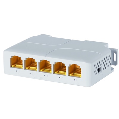 Удлинитель Ethernet с передачей РоЕ гигабитный; расстояние до 250м; вход 1xRJ-45 1000 Мбит/с с РоЕ 802.3 af/at/bt 85 Вт, выход: 4xRJ-45 1000 Мбит/с для подключения 4 камер, порт 2: до 60 Вт, порты 3-5: до 30 Вт, монтаж на стену или на DIN-рейку; грозозащита до 6 кВ; -10...+55, 85х58х24 мм. До 4-х устройств в линию!