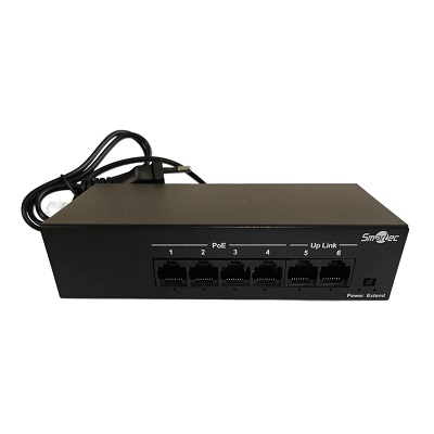 Коммутатор сетевой 6 портовый с РоЕ; 4xRJ45 PoE 10/100 Мбит/с, IEEE 802.3af/at; 2xRJ45 Uplink 100 Мбит/с; PoE бюджет до 50 Вт; поддержка режима EXTEND с дальностью связи до 250 м при скорости 10 Мбит/с; Watchdog, DHCP, VLAN; AC 220В, 55Вт; -10... +55°C; 152х70х36 мм.