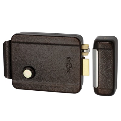 Электромеханический накладной замок, НЗ, универсальный DIN, цилиндр снаружи и изнутри, кнопка изнутри (блокировка кнопки), питание 12В DC/1А, -40°+50°C, окрашенная сталь, цвет - коричневый.