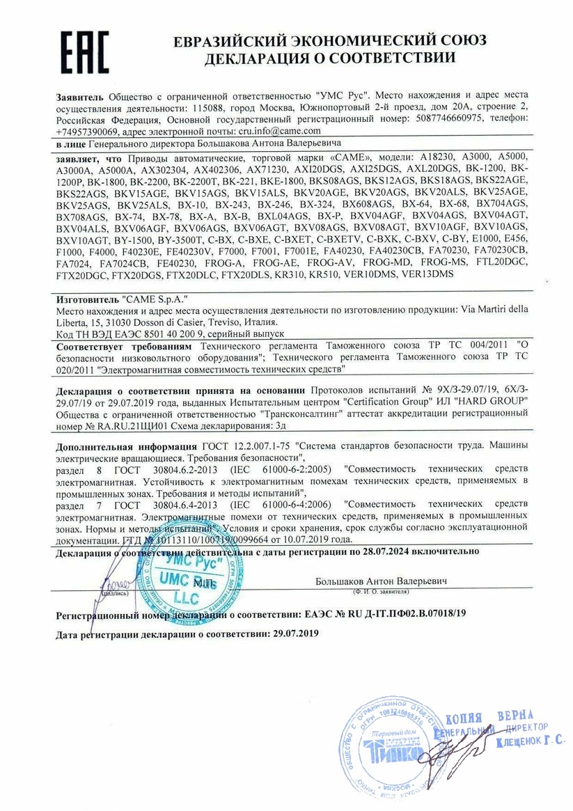 Сертификат CAME BK-1800