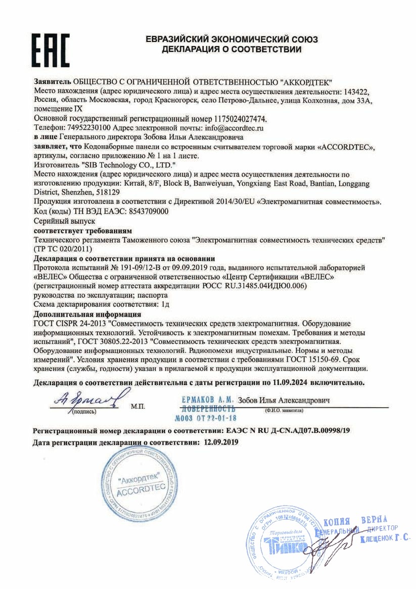 Сертификат PERCo-BH02 0-10 (в комплекте с крепежом)