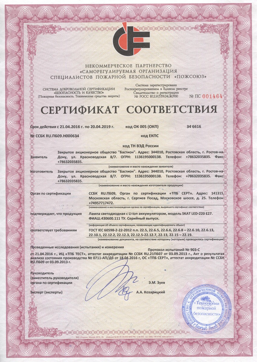 Сертификат SKAT LED-220 E27