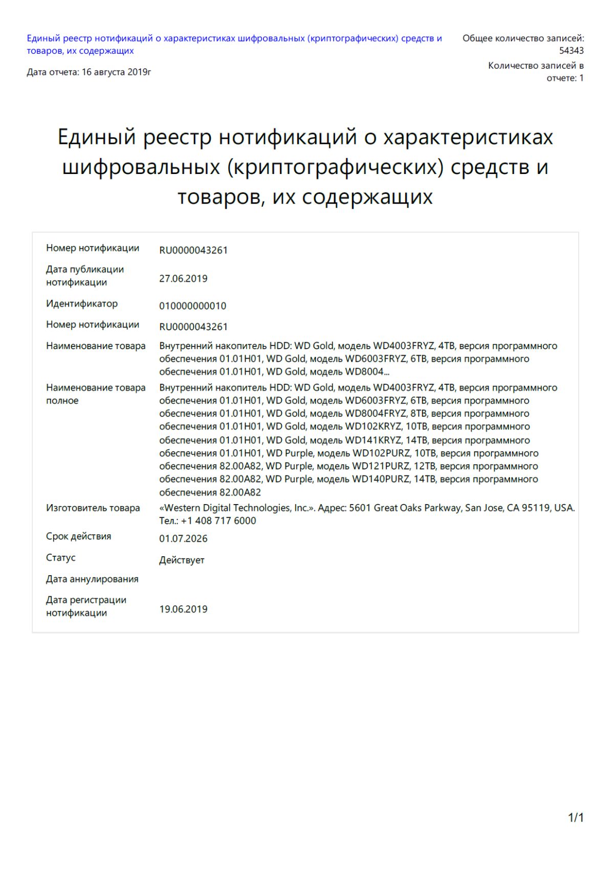 Сертификат HDD диск / Western Digital Gold 4tb /7200rpm, 256mb / WD4003FRYZ / SN:VBH4MKDF