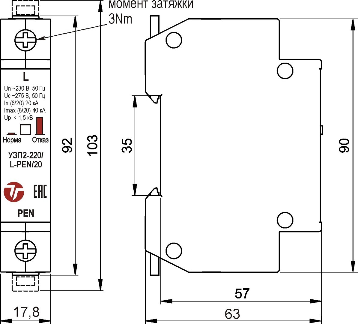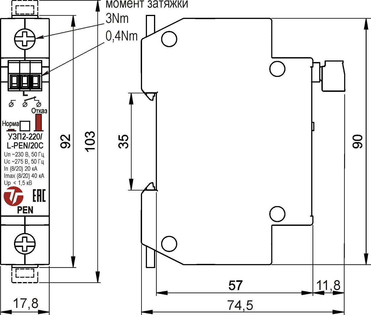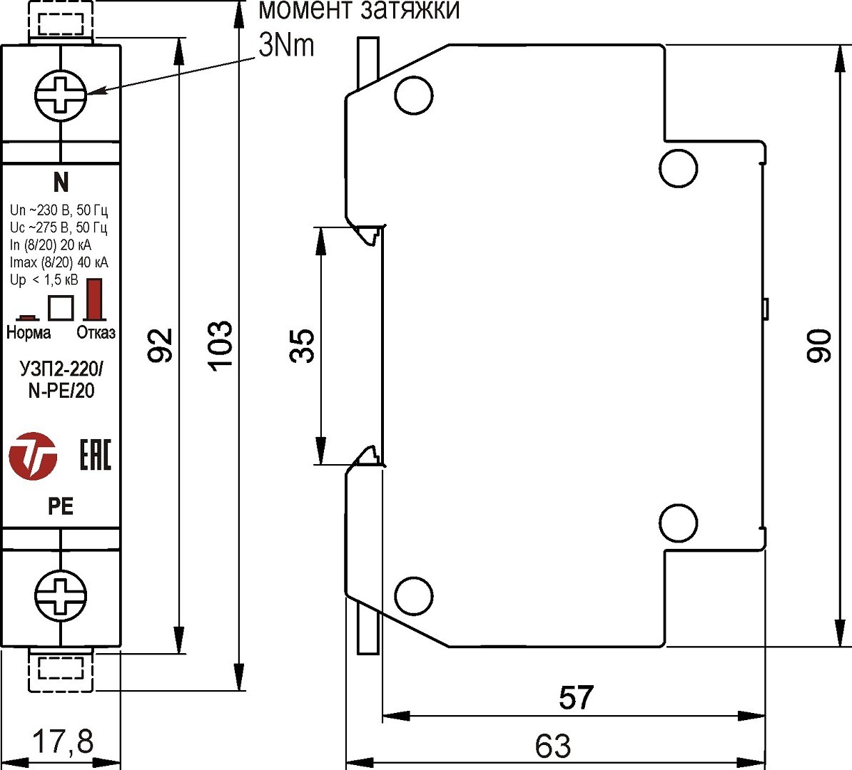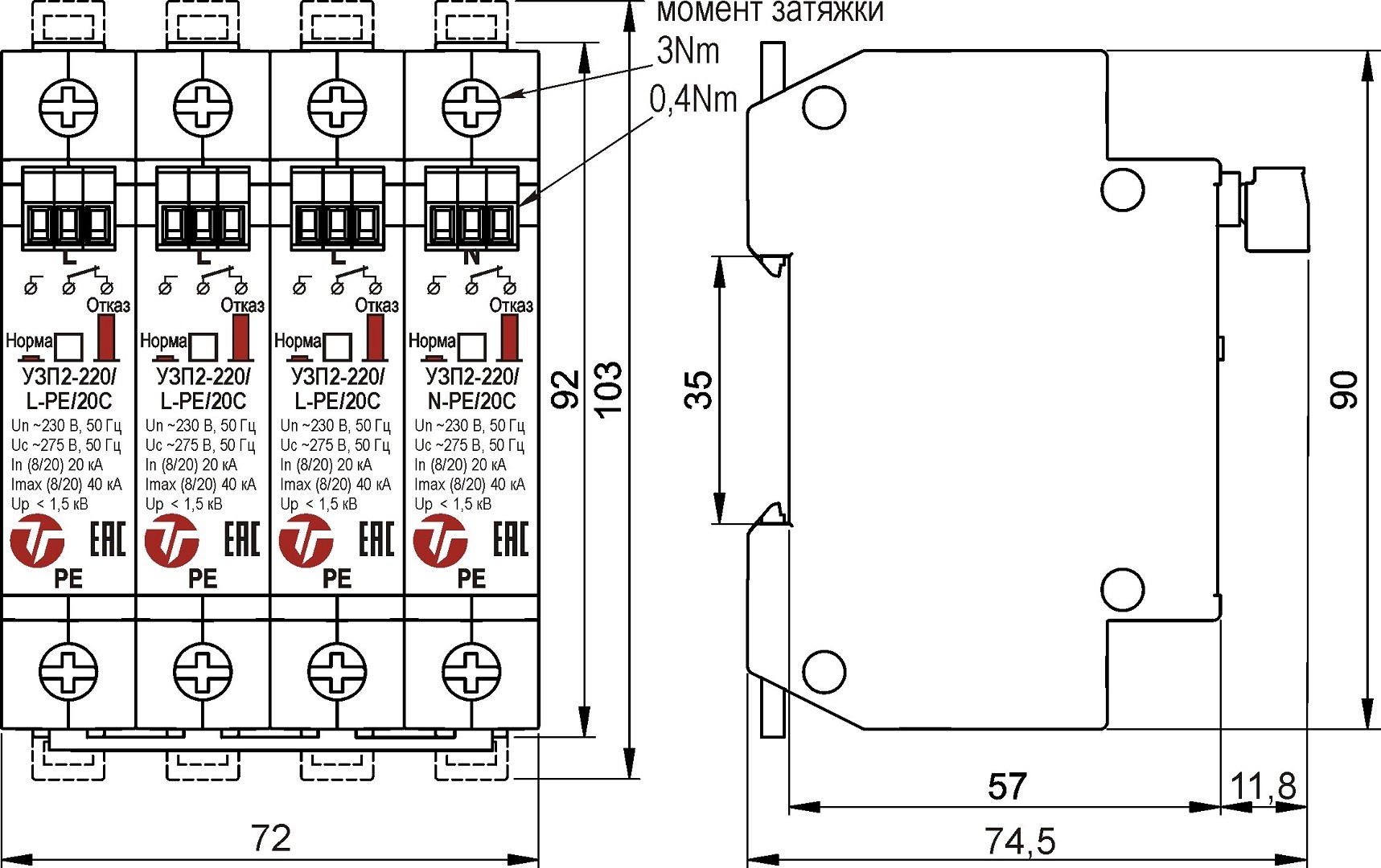 Габаритные размеры УЗП2-220/N-PE/20С
