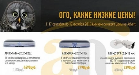 В период с 17 сентября по 17 октября действует предложение о снижении цен на отдельные модели купольных и уличных камер видеонаблюдения, а также видеорегистраторов марки ADVERT.