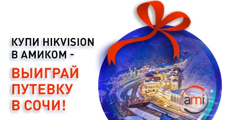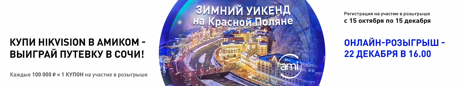 Компания Амиком и флагманский бренд рынка видеонаблюдения Hikvision приглашают в январе 2021 года совершить невероятное путешествие на Красную поляну и в зимний Сочи! 10 путевок на Зимний уикенд и 20 ценных призов будут разыграны среди покупателей оборудования Hikvision в Амиком 22 декабря в 16:00. Подробности участия - у ваших менеджеров, регистрация на розыгрыш - https://www.ami-com.ru/registration-drawing/.
