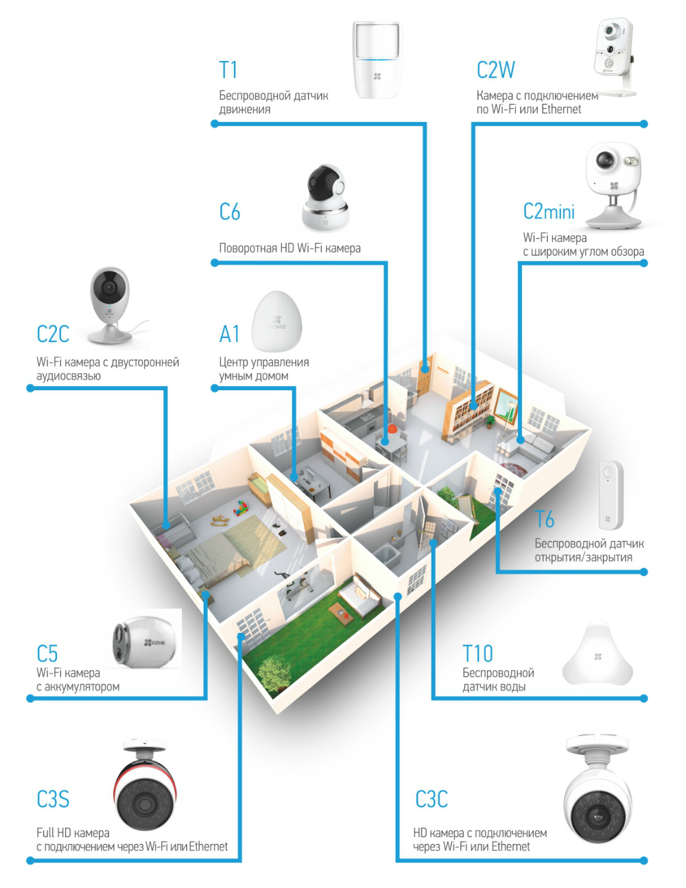 Большой интерес у гостей выставки вызвали системы домашнего видеонаблюдения EZVIZ. На стенде был собран макет «умного дома», чтобы наглядно продемонстрировать работу всех компонентов сети: видеокамер, датчиков и сигнализаций. Камера C2mini — 1-мегапиксельное устройство с подключением по WiFi и широким углом обзора, имела успех среди посетителей.