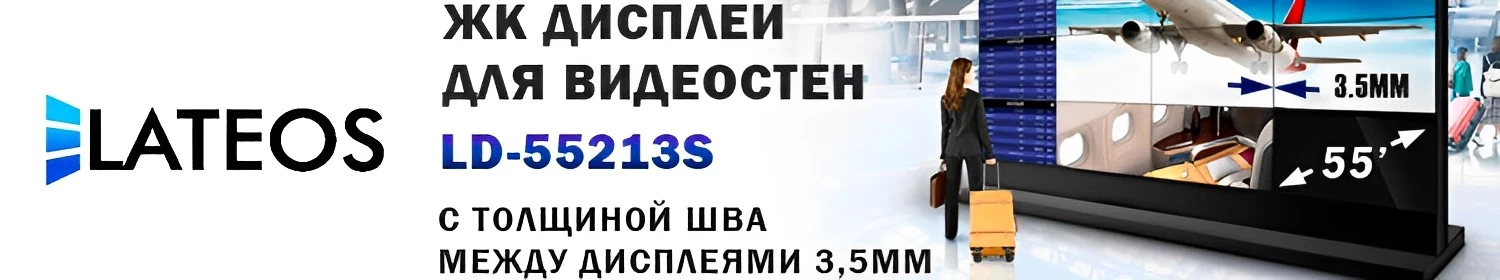 ЖК Панели LD-55213S на базе видеоматрицы типа IPS разрешением 1920х1080 пикселей, яркостью 500кд/м2 и контрастностью 1400:1 применяются для создания больших экранов: видеостен различной конфигурации с толщиной шва между дисплеями 3,5мм.