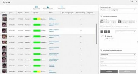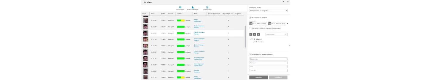 - Построение отчётов по времени, камерам, группам, а также ФИО. Из отчёта можно перейти на соответствующий видеофрагмент, нажав на событие или распознанное лицо.