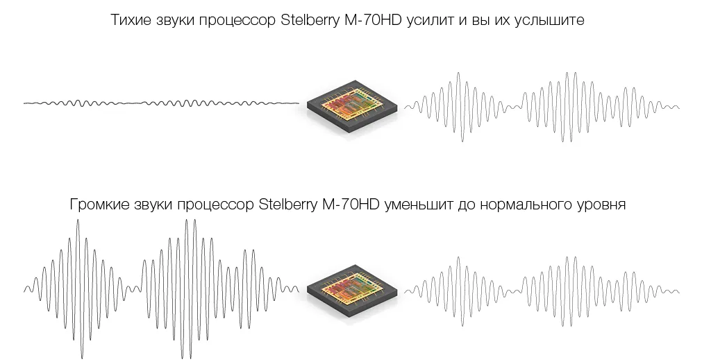 Цифровой микрофон STELBERRY M-70HD оснащен 16-битным процессором с рабочей частотой 12 МГц. Процессор отличается высокой эффективностью. Он запускает работу устройства после того, как была подана энергия, передает в звуковой процессор изменения настройки резистора и конфигурации фильтров и АРУ.