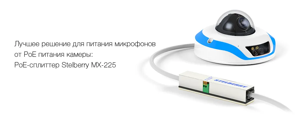 Можно не использовать подключение в электросеть, если подключение микрофона осуществляется по РоЕ с напряжением до +57 В от IP-камеры. Лучше всего подачу питания осуществлять универсальным PoE-сплиттероми MX-225, который преобразует напряжение РоЕ питания в +12 В.