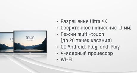 Дисплей может работать как бесконтактный проектор. Контент на него передается с мобильных устройств или компьютера. Есть многоканальный режим, позволяющий получать данные с нескольких устройств. Данные можно передавать по проводной сети или через Wi-Fi.