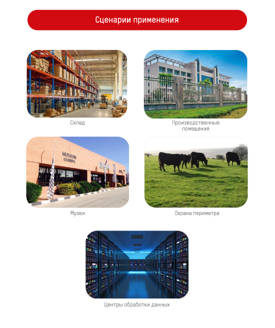 Камеры имеют видеоаналитические функции. Они позволяют отсекать ложные срабатывания тревожной сигнализации от осадков, движения животных и прочего. В тепловизорах используется нейросетевая аналитика которая определяет такие объекты, как «человек» и «транспортное средство». Периметр защищен на расстоянии до 70 м.