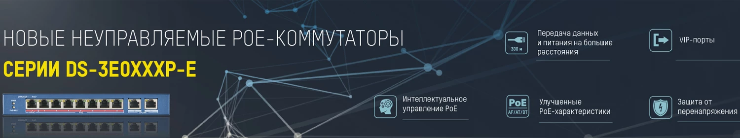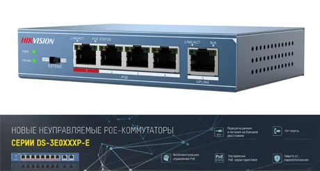 Компания Hikvision представила целый ряд новых моделей неуправляемых коммутаторов PoE-классификации, относящихся к серии DS-3E0XXXP-E. Прежде всего, они оснащены последними изобретениями инженеров и специалистов компании. Значительно расширился перечень функций и возможностей аппаратуры. Все эти качества делают новые модели гораздо более конкурентноспособными по сравнению с предыдущими версиями.
