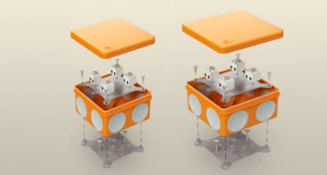 За счет использования в коробках мембран, кабель или труба быстро вводятся внутрь. Конструкцию коробки составляют 2 стальные пластины. Поэтому она надежно монтируется к поверхности потолка или стены. Коробку также можно закрепить на сэндвич-панель. Или использовать прямой монтаж с помощью монтажного пистолета.