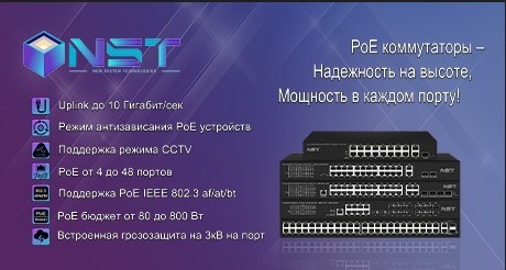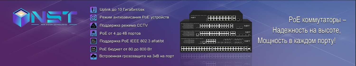 PoE коммутаторы NST - это качественное и надежное оборудование, предназначенное для систем с высокой нагрузкой и требованием к отказоустойчивости. Ассортимент коммутаторов включается в себя модели от 4 до 48 портов PoE, Мощностью на порт - от 15W до 90W, PoE бюджетом - от 80W до 800W и позволяет реализовать самые сложные проекты с оборудованием PoE.