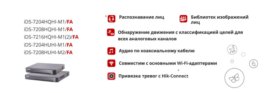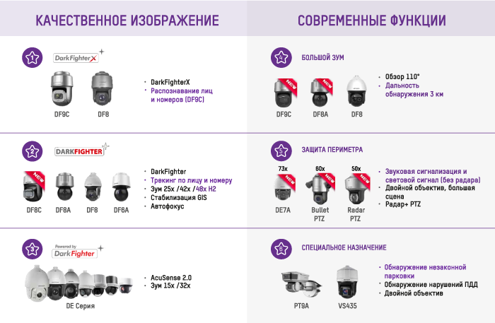 Базовые исполнения отличаются формой корпуса – купольный и цилиндрический. IP-камеры выпускаются с матрицами 8 Мп, 5 Мп, 4 Мп, 2 Мп и объективами 2.8 и 3.6 мм. Разрешение HDCVI камер 5 Мп, объектив 3,6 или 6 мм. Имеются модели с питанием по коаксиальному кабелю. Поддержка интеллектуальных функций в HDCVI камерах обеспечивается гибридным видеорегистратором XVR5000-4KL-I2.
