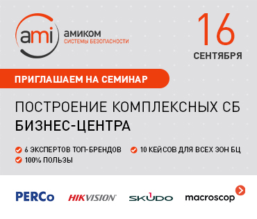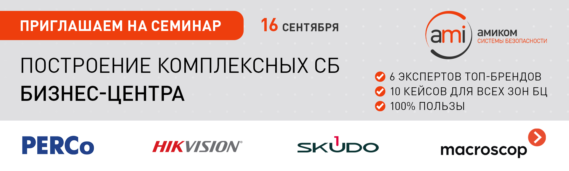 16 сентября вместе с топовыми брендами PERCo, Hikvision, Macroscop и SKUDO разберем организацию комплексных систем безопасности в офисах и бизнес-центрах.