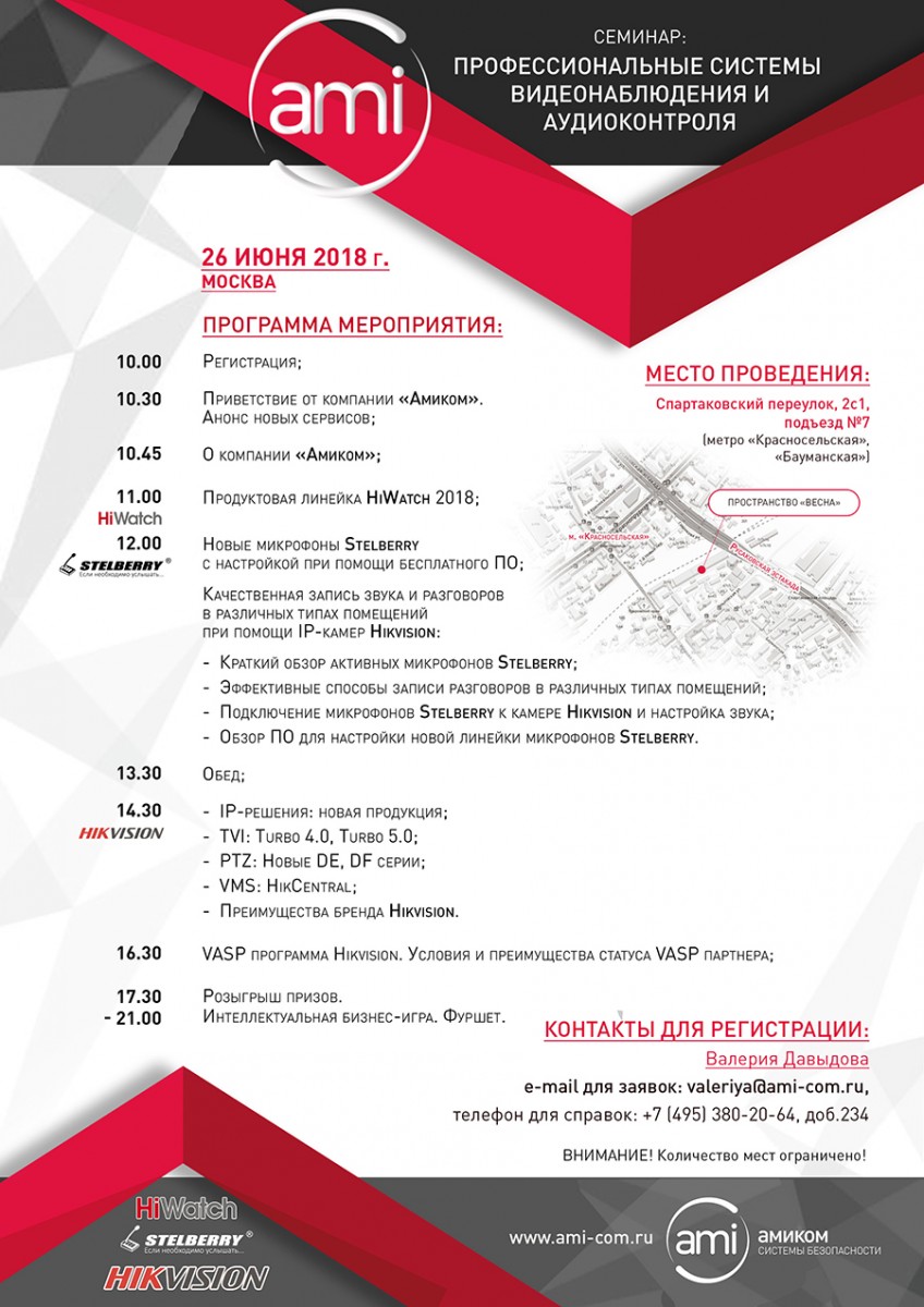 26 июня 2018 года в центре Москвы компания "Амиком" совместно с партнерами, ведущими производителями инновационных продуктов и систем безопасности Hikvision, HiWatch и Stelberry, провели большой семинар