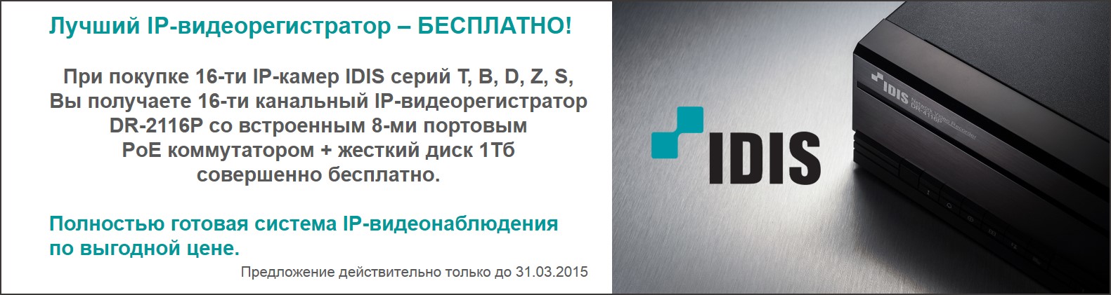 Компания предлагает существенную экономию при покупке системы видеонаблюдения. По условиям акции при покупке 16 IP-видеокамер IDIS серий T, B, D, Z, S вы получите бесплатно сетевой 16-канальный регистратор DR-2116P для записи Full HD потока со встроенным PoE-коммутатором и жёстким диском 1 Тб.