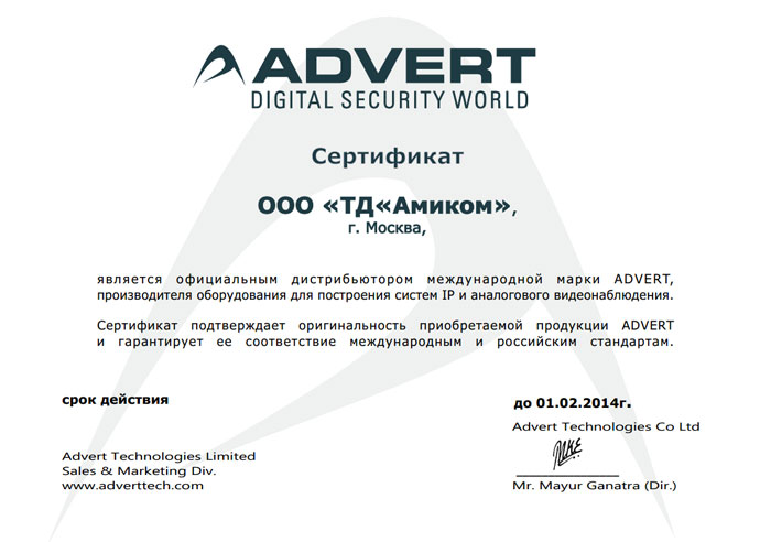 В 2012 году Торговый дом «Амиком» официально стал частью международной команды ADVERT. Сертификат, подтверждающий оригинальность приобретаемой продукции и гарантирующий ее соответствие международным и российским стандартам, продлен до февраля 2014 года.