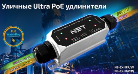 Новые уличные защищенные удлинители Ultra PoE - NS-EX-1FP/W, NS-EX-1GP/W! Позволяют передавать данные и питание на расстояние до 250м. Максимальная передаваемая мощность - 90W. Этого будет достаточно для подключения самых мощных и требовательных к качеству питания PoE камер и точек доступа.