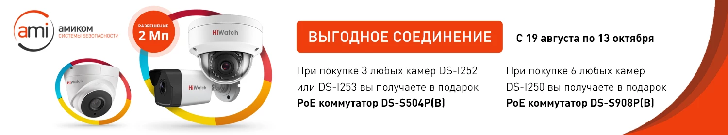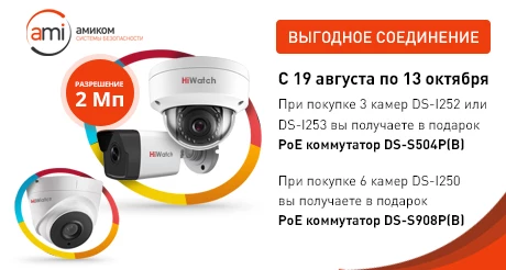 - 3 любых камер DS-I252 или DS-I253 вы получаете в подарок PoE коммутаторDS-S504P(B) РРЦ 3 510р.;