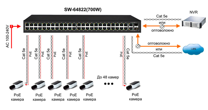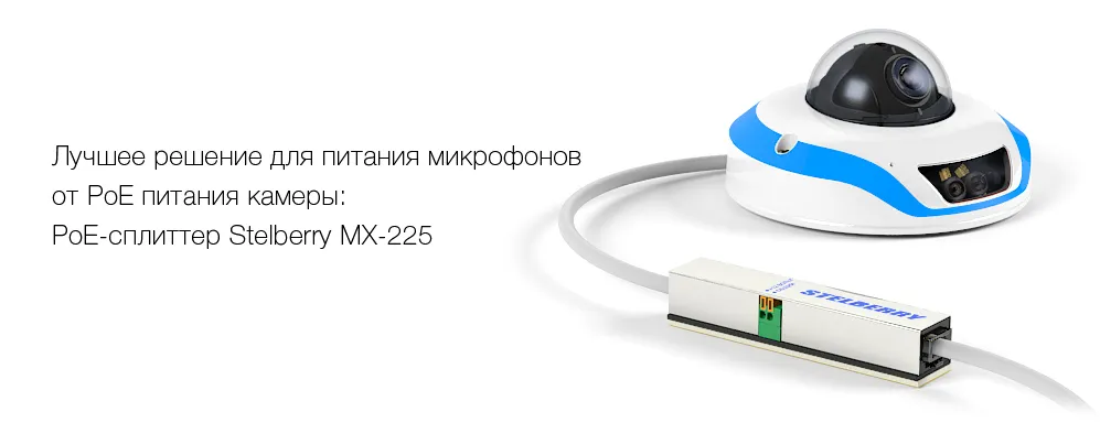 Подключение осуществляется посредством кабелей КВК, КВТ, ШСМ, ШВЭВ или их аналогов. Производитель рекомендует PoE-сплиттер Stelberry MX-225 для передачи питания от PoE-камер к микрофону.