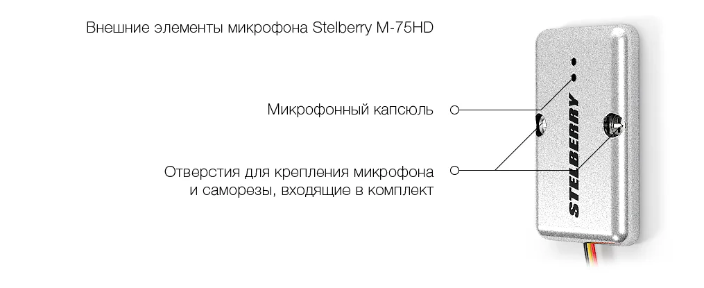 На корпусе Stelberry M-75HD есть 2 крепежных отверстия с диаметром 3 мм, которые находятся на расстоянии 27 мм. Для фиксации устройства в комплекте поставляются 2 самореза и 2 дюбеля. Закрепить микрофон можно на стене, столе и другой мебели.
