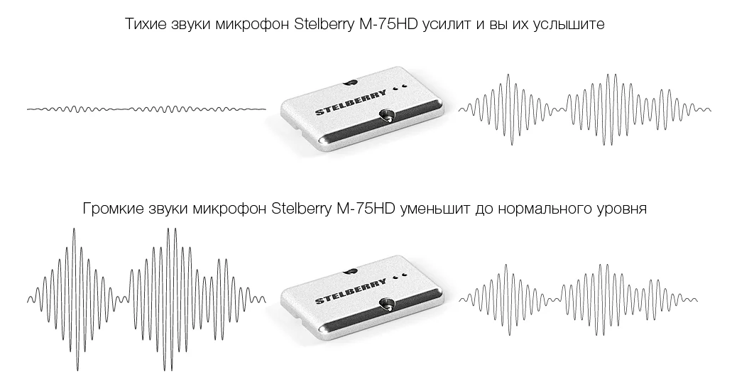 В Stelberry M-75HD соотношение сигнал / шум составляет 75 дБ, что сопоставимо с уровнем студийных микрофонов. Благодаря этому прибор способен отчетливо передать даже шепот. Интеллектуальная АРУ адаптирует работу прибора к любой обстановке, оперативно настраивая чувствительность, чтобы можно было услышать любой звук в помещении. При этом, система не реагирует на хлопки и другие резкие звуки, предотвращая потерю качества из-за резкого снижения чувствительности.
