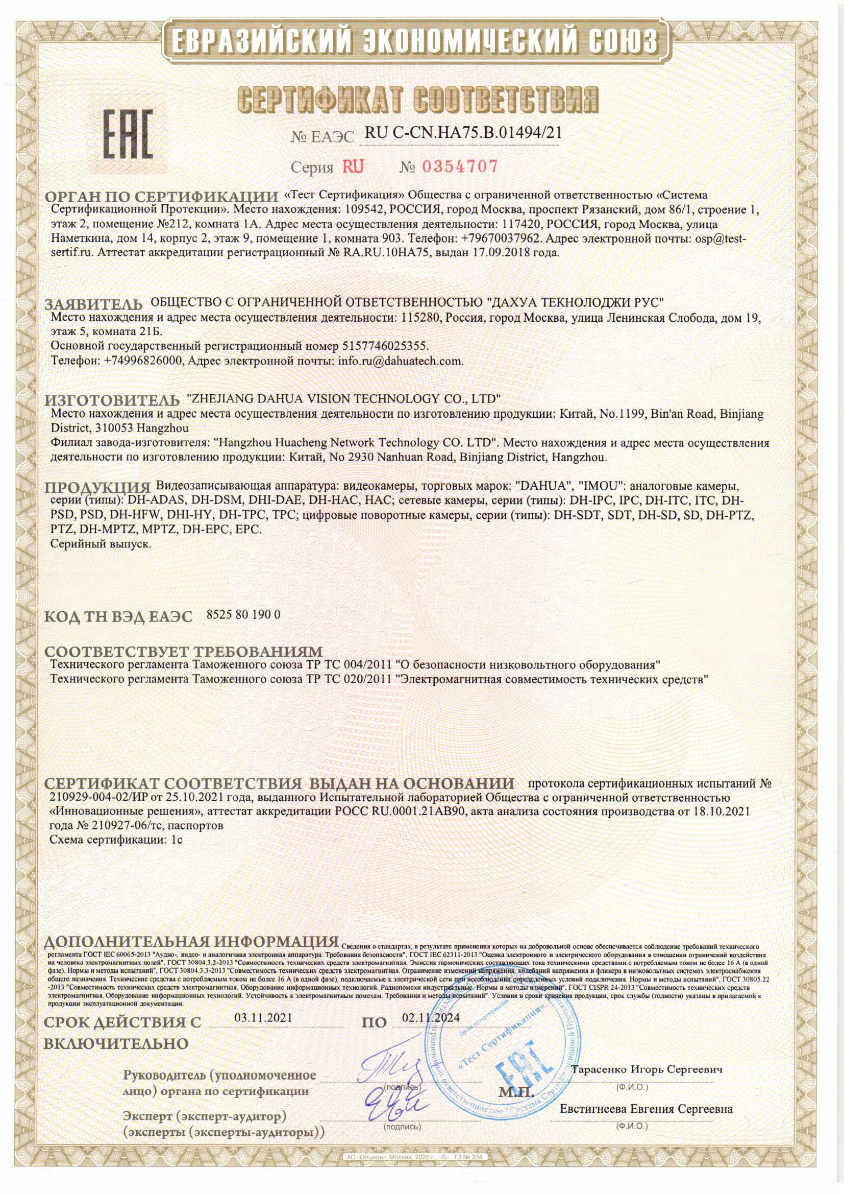 Сертификат DH-IPC-HFW3449T1P-ZAS-PV