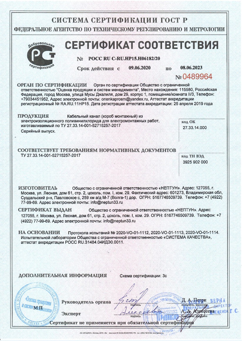 Сертификат Кабель-канал белый 2-й замок в п/э 60х40 (40м/уп) Промрукав (PR.0560401)