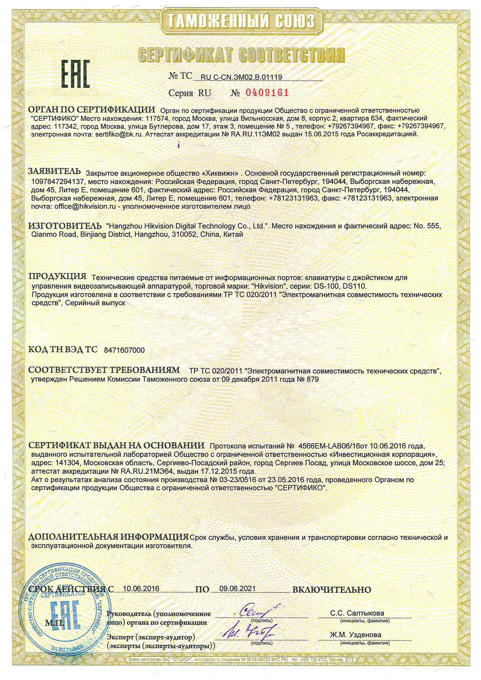 Сертификат DS-1100KI(B)